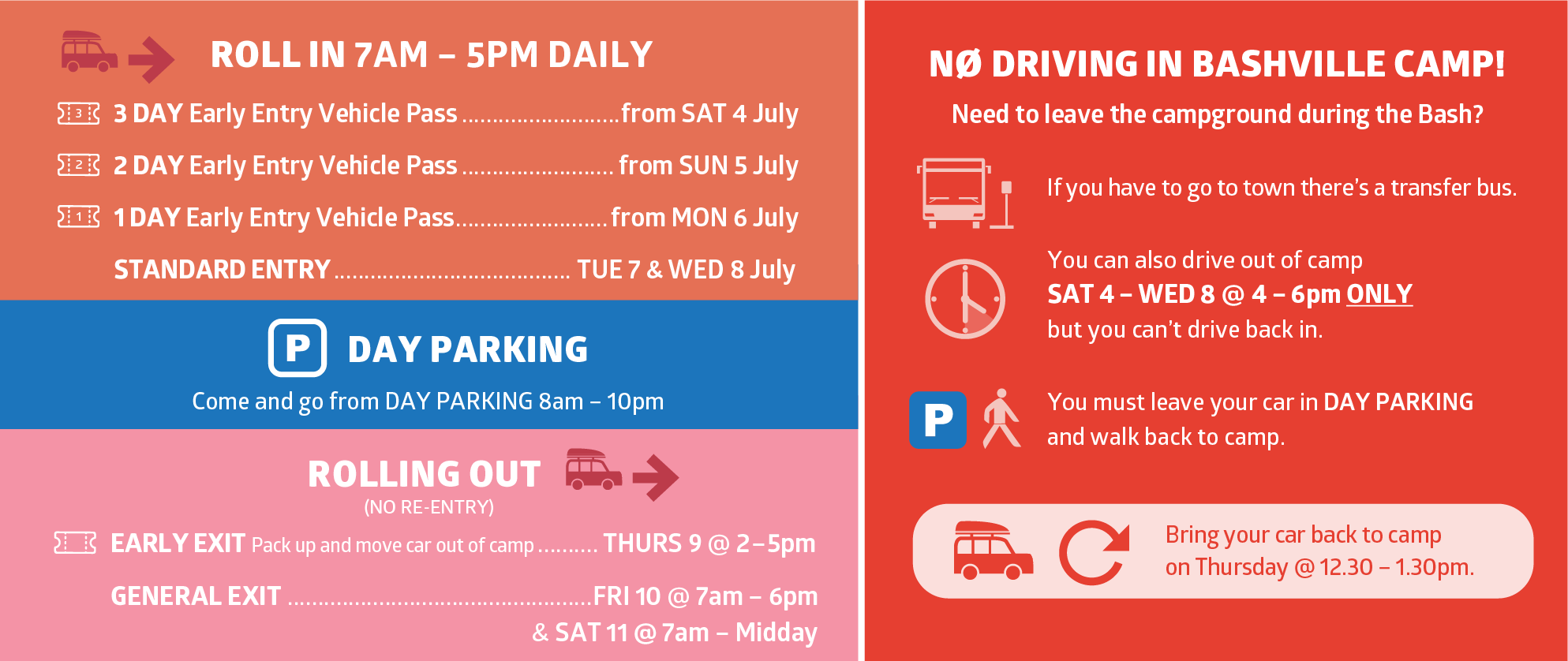 Your Vehicle Entry Pass determines the dates & times that you can come and go from the Bashville campground. Re-entry is not permitted after you’ve rolled out of the festival grounds.
